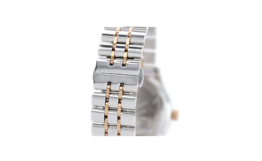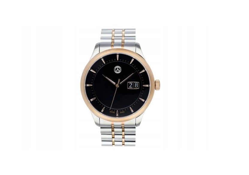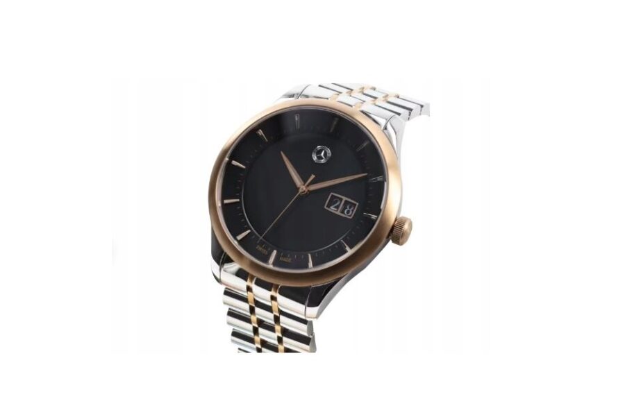 Elegancki męski zegarek ze szwajcarskim mechanizmem kwarcowym Ronda 510 BigDate ma polerowaną kopertę ze stali szlachetnej z cofniętym bezelem w kolorze matowionego złota jest atrakcyjnym dodatkiem. Czarny cyferblat, chroniony przez antyrefleksyjne i lekko wypukłe szafirowe szkiełko, jest wzbogacony wypukłymi złotymi indeksami. Duże, obramowane okienko daty zapewnia dobrą czytelność wskazania. Bransoleta ze stali nierdzewnej o srebrno-złotym dwukolorowym wzorze z eleganckim zapięciem motylkowym, zapewnia wygodne dopasowanie do nadgarstka. Złoty kolor jest naniesiony przez powlekanie PVD. Aby zapewnić niezawodny odczyt czasu nawet w ciemności, indeksy i wskazówki są pokryte świecącą masą SuperLumiNova®. Zegarek jest wodoszczelny do 5 ATM.