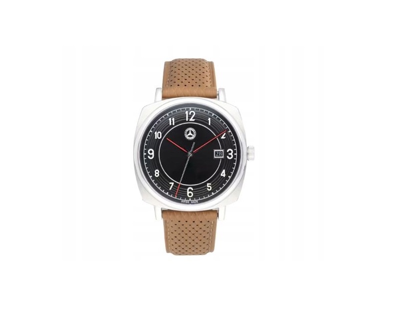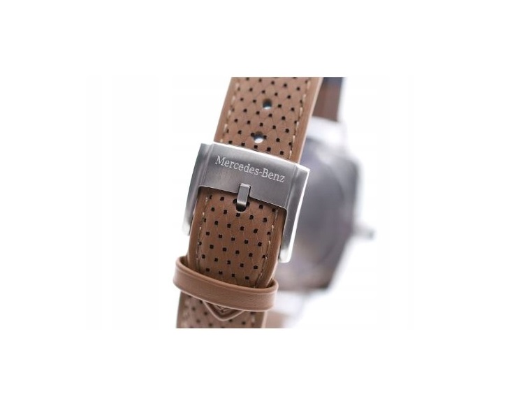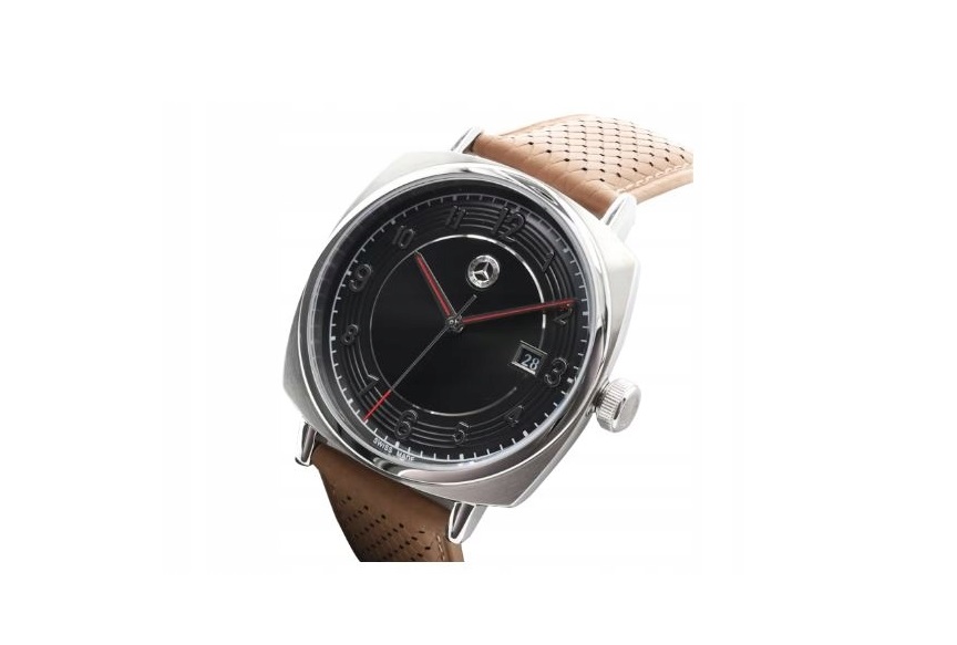Udany hołd – elegancki męski zegarek ze szwajcarskim mechanizmem kwarcowym Ronda 515 został zaprojektowany w całości w duchu klasycznego modelu Mercedes-Benz Pagoda. Elementy wzornictwa samochodowego zostały umiejętnie przełożone na świata zegarków: wygląd Pagody, z jej wyraźnymi krawędziami i miękkimi, zamaszystymi powierzchniami, został zinterpretowany w kanciastym kształcie koperty z okrągłym bezelem. Boki koperty odpowiadają kształtowi osłony chłodnicy, podczas gdy ucha bazują na kształcie reflektora. Koronka odpowiada elementom obsługi na tablicy rozdzielczej. Kolejną atrakcją jest wzorowany na zegarze Pagody cyferblat, chroniony antyrefleksyjnym szafirowym szkiełkiem. Ponadto dodano typowe elementy z ery zegarmistrzostwa lat 60-tych; w wyniku tej stylizacji a cyferblat jest wypukły w kierunku krawędzi. Oprócz wskazywania godzin, minut i sekund, zegarek ma komplikację daty. Zegarek męski jest wodoszczelny do 5 ATM. Pasek ze skóry cielęcej w kolorze koniaku z wytłoczeniami i perforacjami przypomina tapicerkę foteli legendarnej Pagody, a jednocześnie zapewnia najwyższy komfort noszenia.